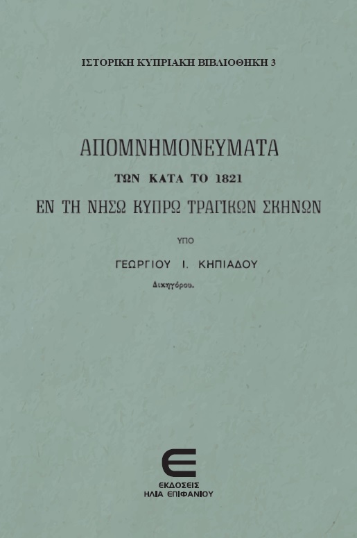 Ένα από τα σημαντικότερα βιβλία για τα όσα διαδραματίστηκαν το 1821 στην Κύπρο είναι η ολιγοσέλιδη έκδοση του Γεώργιου Κηπιάδη με τίτλο «Απομνημονεύματα των κατά το 1821 εν τη νήσω Κύπρω τραγικών σκηνών», η οποία εκδόθηκε στην Αλεξάνδρεια το 1888 και επανεκδόθηκε εμπλουτισμένη την ίδια χρονιά. Παρά το γεγονός ότι έχουν περάσει περισσότερα από εκατό τριάντα χρόνια από την έκδοση του βιβλίου, ελλείψει άλλων ουσιαστικών πηγών παραμένει μέχρι τις μέρες μας το σπουδαιότερο για τα τραγικά γεγονότα που συνέβηκαν τότε στο νησί.